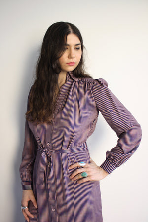 Our first shirtdress! An inset belt in the back creates a beautiful bloused look without being fussy, while the front tie remains adjustable for your comfort. Navy/pink stripe is classic but fun and complimented by pink buttons. Side pockets.